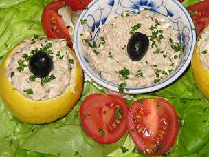 • Remplissez généreusement les citrons évidés avec cet appareil et décorez d'une olive noire au dessus.