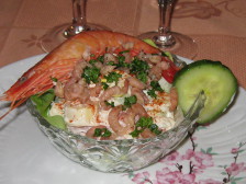 • Dans un saladier mélangez la moitié des crevettes grises avec les coeurs de palmier coupés,