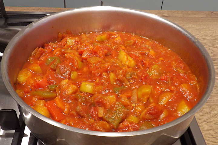 • Versez les dés d'aubergine et de courgette dans la sauteuse, déglacez avec le vin blanc, ajoutez la pulpe et le concentré de tomate, le thym, le laurier et le persil réunis en bouquet garni, ajoutez le piment doux et le paprika, salez et poivrez.