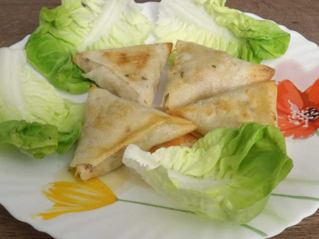 • 300 g de filets de poisson blanc (lieu noir au cabillaud par exemple), • 8 feuilles de brick, • 50 g de beurre fondu, • 1 c-à-café de cumin en poudre, • 2 belles gousses d'ail, • 1 oœuf (on n'aura besoin que du blanc), • 1 grosse c-à-soupe de coriandre fraîche hachée, • 1 grosse c-à-soupe de persil plat haché, • 16 crevettes roses cuites, • 2 citrons jaunes, ketchup et tabasco pour la sauce, • Des feuilles de laitue pour la dégustation, • Du sel et du poivre. Préparation : • Épluchez et hachez très très finement les gousses d'ail. • Lavez les feuilles de persil et de coriandre et ciselez-les finement avec des ciseaux dans des verres. • Hachez les filets de poisson dans un robot, mais au point d'n faire une purée. • Mélangez soigneusement le poisson, le blanc d'œuf, l'ail, les herbes, les épices, sel et poivre. • Décortiquez les crevettes, coupez-les en deux dans la longueur et enlevez l'intestin. • Coupez chaque feuille de brick en 2 demi-cercles et divisez la farce en 8 parts égales, pour moi ça représentait 21,8 g par briouates. • Prenez une demi feuille de brick et badigeonnez-la de beurre fondu de chaque côté sans trop charger, pliez-la en deux dans la longueur pour en faire une sorte de grand rectangle. Placez sur le bas la dose de farce et deux demi crevettes, repliez en triangle plusieurs fois (je vous conseille d'aller voir la technique de Nadia ici). • Réservez les briouates au frais en attendant le service. • Au moment du service préchauffez le four à 210° chaleur tournante et pendant ce temps préparez la sauce en mélangeant le jus des citrons, un peu d'eau, du ketchup et du tabasco, le tout à doser à votre convenance. Lavez les feuilles de laitue et essorez-les. • Badigeonnez une nouvelle fois les briouates de beurre fondu avant de les enfourner dans le four chaud. La cuisson prend 12 à 15 minutes. • À déguster bien chaud avec des feuilles de laitue pour prendre les briouates avec les doigts et les tremper dans la sauce.