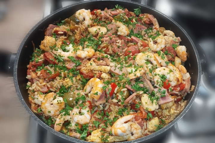 Ce 24 juillet 2025 j'ai fait ma première jambalaya, un plat originaire de Louisiane. Comme pour la plupart des plats emblématiques d'une région il en existe autant de recettes que de cuisinier-ères. En voici ma version faite à partir de plusieurs recettes du web et de ce qu'on trouve ici.