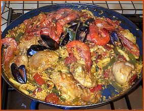 Les paellas espagnoles (poêles) sont trop grandes pour les brûleurs de ma cuisinière, impossible d'avoir une chaleur uniforme et au final des paellas (à manger) pas très réussies, c'est pourquoi j'ai essayé d'utiliser ma grande sauteuse de 28 cm (mesurés en haut) et de cuire le riz séparément tout en lui conservant la couleur et le goût de la paella "normale". C'est une méthode très efficace pour faire une paella pour 5 personnes au maximum.