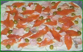 • Répartissez sur la pâte les rondelles d'oignon, les saumons et les olives bien