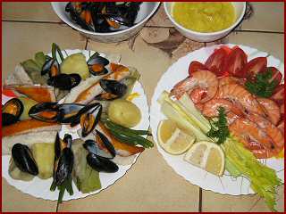 • Sur un autre plat répartissez la morue, le cabillaud et les bulots, tous soigneusement