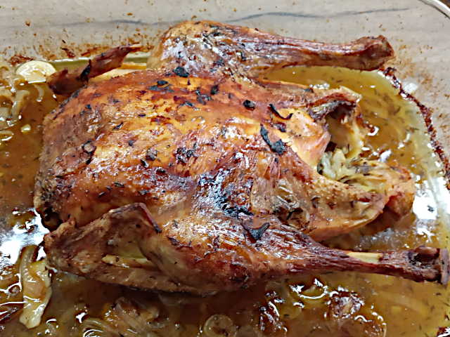 • Quand le dos du poulet a commencé à bien dorer retournez-le, ajoutez l'oignon et le reste d'ail et remettez à cuire pour au moins une heure toujours à 180° chaleur tournante. Continuez d'arroser régulièrement et de remettre un peu de bouillon si nécessaire.